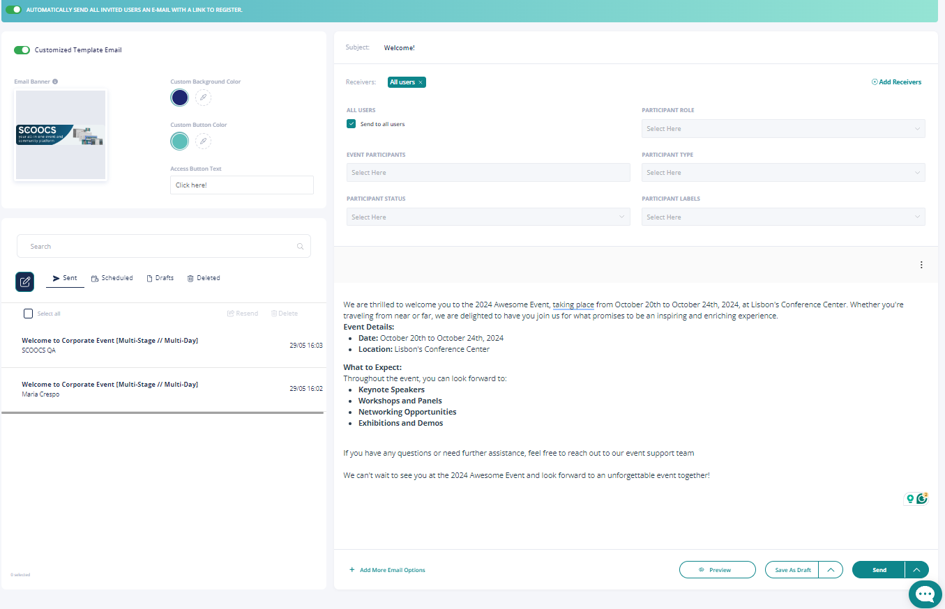Introducing our brand-new Communication Center – your ultimate tool for seamless event communication! With this feature, event hosts can now effortlessly send out invite emails, regular updates, and important announcements to all participants. Whether you’re sharing event details, sending reminders, or making last-minute announcements, the Communication Center ensures that your messages reach your audience promptly and effectively. Stay connected with your attendees and keep everyone informed with ease, all through one centralized platform. Make your event communication smoother and more efficient with our Communication Center!
